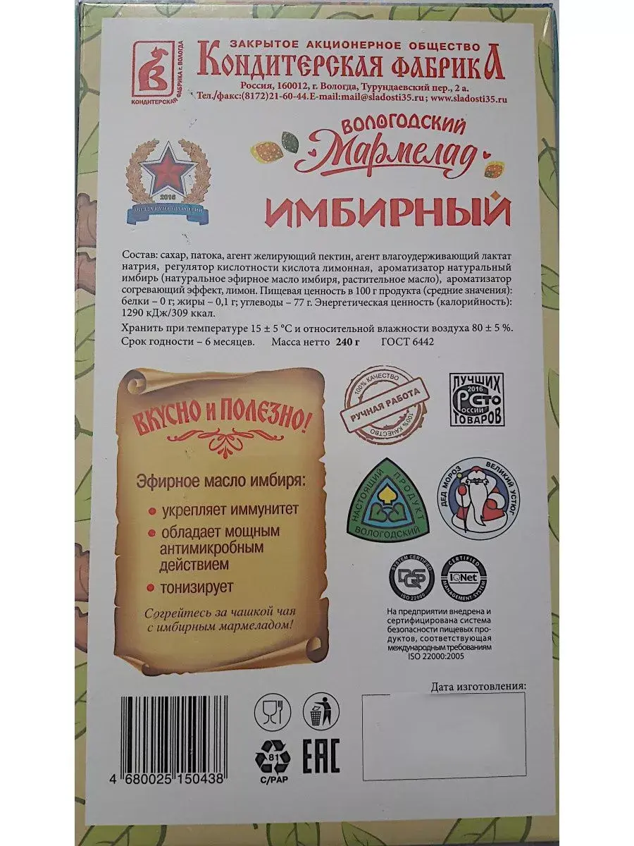 Мармелад Вологодский Имбирный. Произведено ЗАО Кондитерская фабрика г. Вологда