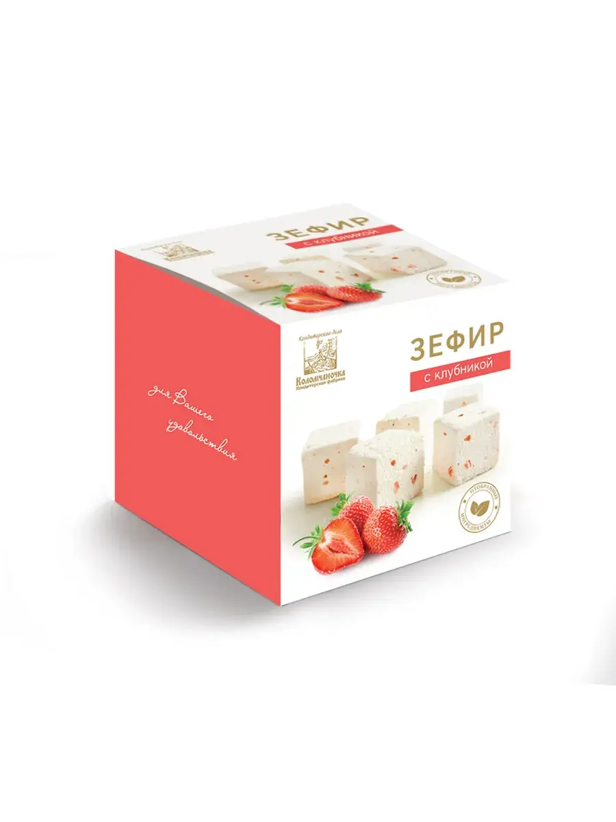 Зефир с добавлением кусочков клубники. Состав: cахар-песок, патока, пюре яблочное, клубника сублимированная, концентрированный сок клубники, сахарная пудра, сухой яичный белок, желирующий агент - пектин, регулятор кислотности - кислота молочная. Пищевая ценность на 100г продукта: жир 0г, белок 0,4г, углеводы 78,0г. Энергетическая ценность на 100г продукта: 310 ккал/1340 кДЖ. ГОСТ 6441-2014. Срок годности 60 суток. Хранить при температуре 18-25˚С и относительной влажности воздуха не более 75%. Масса нетто 180г